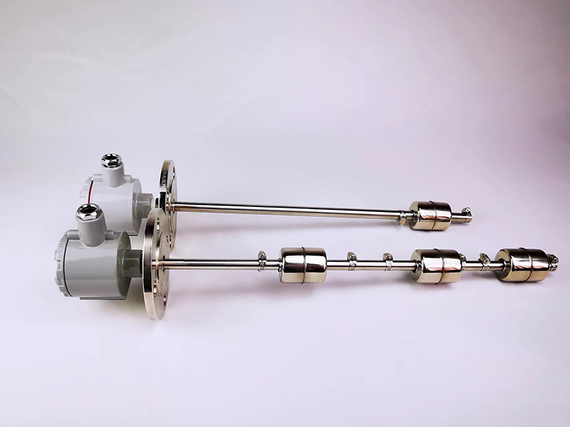干簧管式浮球液位計工作原理:干簧管式浮球液位計由浮球、插桿等組成。浮球液位計通過連接法蘭安裝于容器頂上,浮球根據排液體體積相等等原理浮于液面,當容器的液位變化時浮球也隨著上下移動,由于磁性作用,浮球液位計的干簧受磁性吸合,把液面位置變化成電信號,通過顯示儀表用數字顯示液體的實際位置,浮球液位計從而達到液面的遠距離檢測和控制。浮球變送器上的浮球隨液位上下浮動,使傳感器得到正比于液位的電阻信號,經轉換放大變送輸出DC4 -20mA的標準信號。可與多種二次儀表或計算機構成對液位進行遠距離調節的測量,顯示和控制系統。